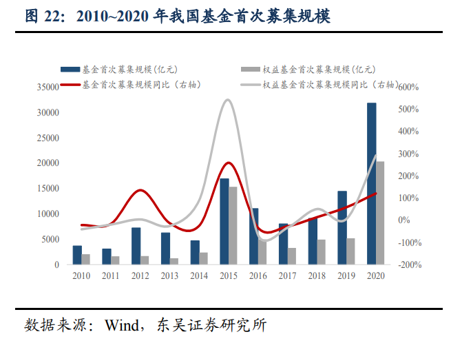 2015年,我國基金首次募集規模較2014年暴增,是2014年3倍多??赡且荒晖钢Я司用駧啄甑幕鹳徺I力,而牛市后的狂跌也讓基民幾年后才解套,直到2020年才重拾對基金的信念。
