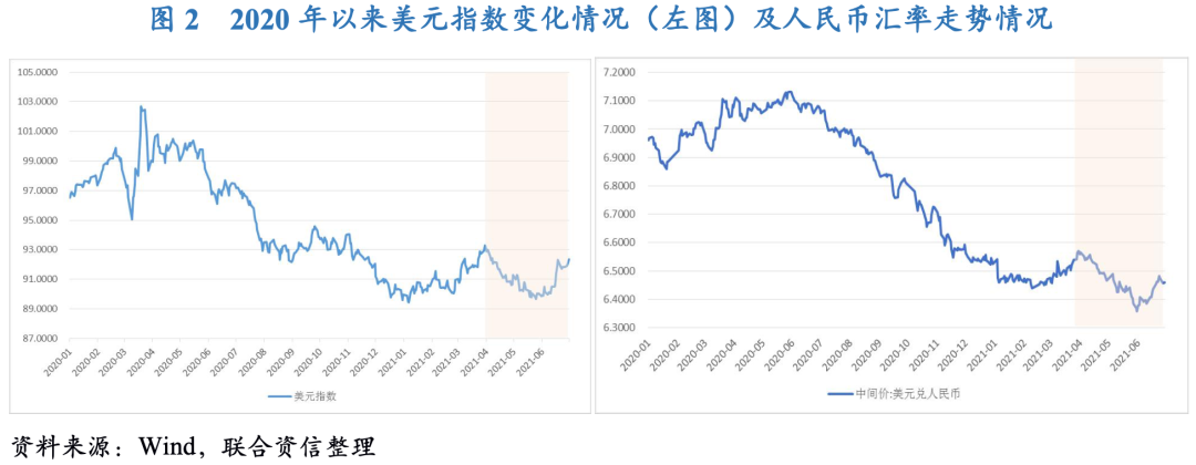 從人民幣匯率走勢來看,2021年年初以來,人民幣匯率走勢與美元指數走勢之間表現出較強的負相關性(圖2)。4-5月期間,美國通脹持續攀升、貨幣政策持續保持寬松、疫情持續反復等因素推動美元指數從93左右跌至90關口下方;另一方面,中國經濟的持續回暖則給人民幣匯率提供了較強的支撐,人民幣匯率在5月底回到6.40關口下方,達到近三年以來的新高。