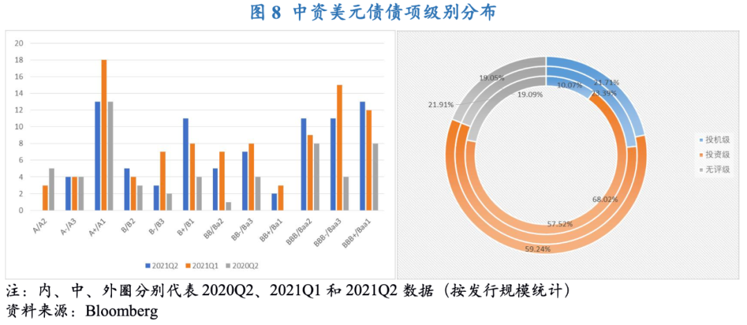 在有評級的中資美元債中,2021年二季度投資級別中資美元債發行期數合計52期,占全部發行期數的34.0%,環比和同比分別減少了2.3個和2.5個百分點;投資級債券發行規模合計占總發行規模的59.2%,環比增加了1.7個百分比,同比減少了8.8個百分點,說明本季度投資級發行債券期數和規模較上季度明顯回落。此外,投機級別中資美元債發行期數和規模也較上季度明顯下降,BBB-級以下高收益債券發行期數合計33期,發行規模占總發行規模的21.7%,環比減少了1.7個百分點,同比增加了11.6個百分點。