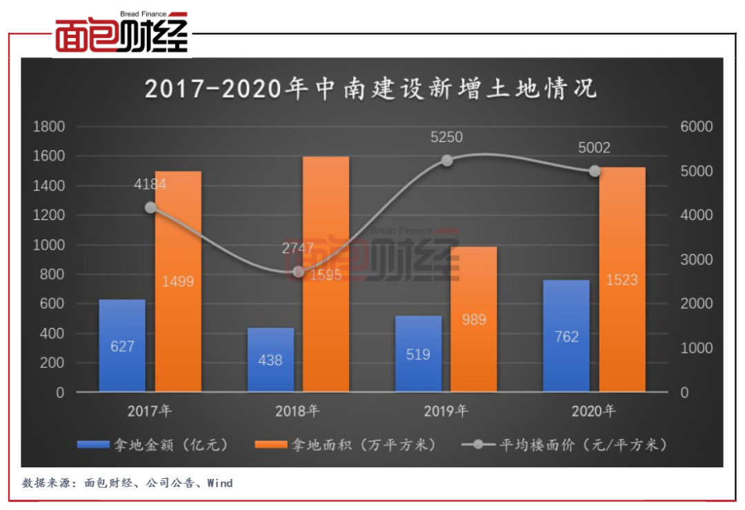 2020年,中南建設新增項目107個,規劃建筑面積合計約1523萬平米,同比增長54%;拿地金額為762億元,同比增長46.7%;平均樓面價5002元/平米,略低于2019年但仍維持較高水平。