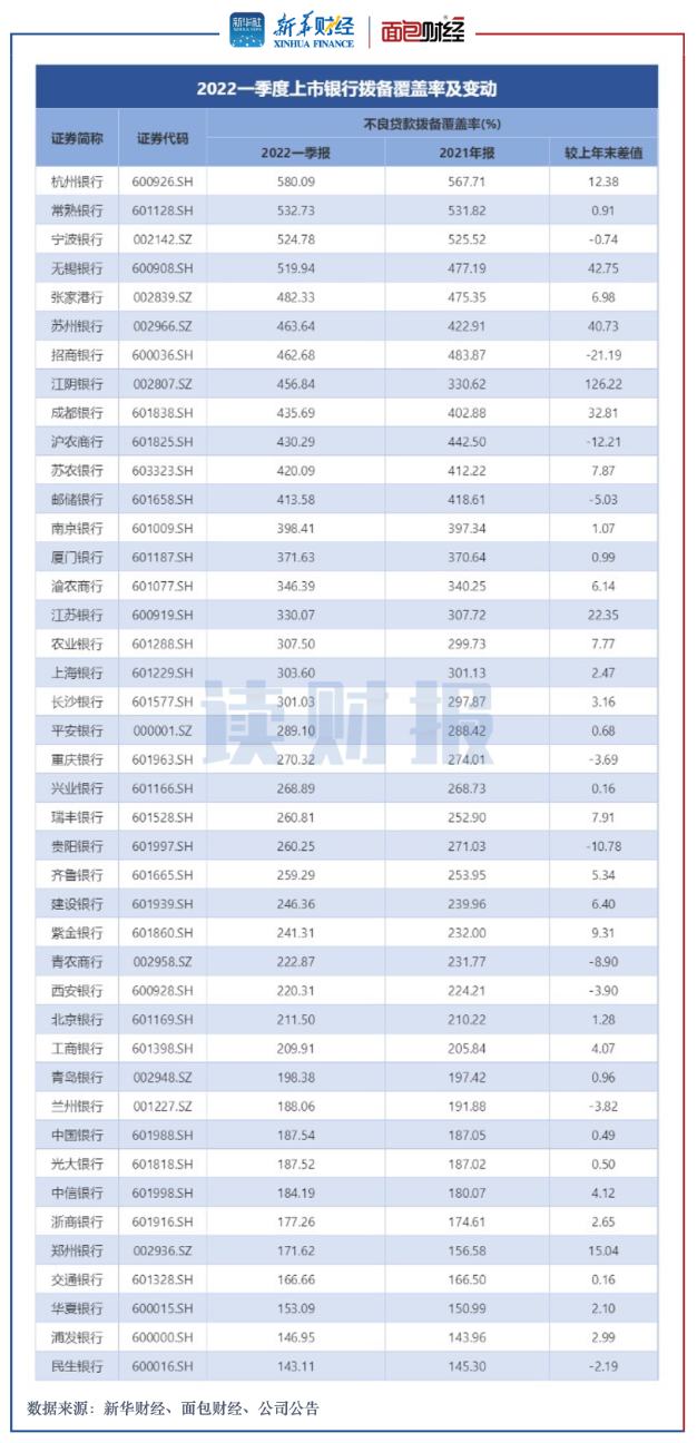 截至2022年一季末,有10家上市銀行撥備覆蓋率較去年年末降低。其中,招商銀行降幅最大,該行撥備覆蓋率較上年末下降21.19個百分點至462.68%。