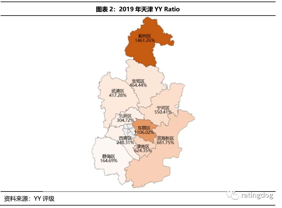 天津市2019年YY Ratio在全國各省(市/區(qū))排名第6,為 618.09%,整體債務(wù)壓力較大。分區(qū)域來看,薊州區(qū)和東麗區(qū)YY Ratio最高,均超1000%;其次為濱海新區(qū)、津南區(qū)和寧河區(qū),YY Ratio均超過了500%。