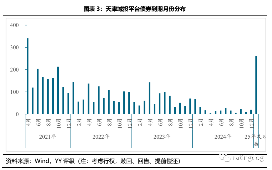 截至21年3月16日,天津區(qū)域城投平臺債券余額4,193.19億,其中1,798.60億元將于21年到期,占比42.89%,整體償債壓力較大。從存續(xù)債到期月份來看,21年4-11月均有超100億債券到期,其中4月份到期債券超300億。