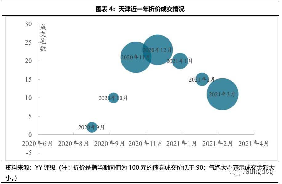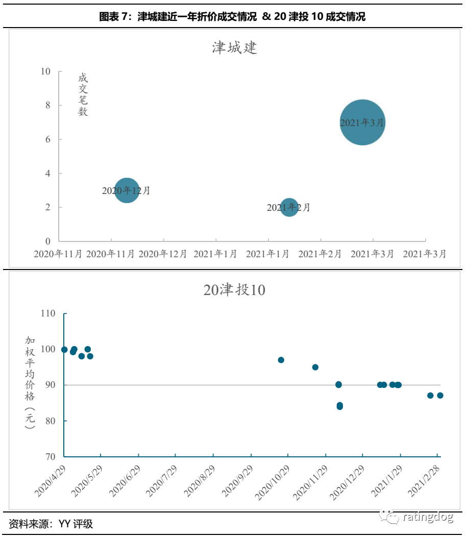 從成交情況來看,津城建折價(jià)成交始于20年12月,至21年3月,折價(jià)成交開始增多,或受區(qū)域負(fù)面輿情影響所致。20津投10成交價(jià)20年4月以來維持在90以上,20年12月出現(xiàn)零星折價(jià)成交,21年2月底價(jià)格走低重現(xiàn)折價(jià)成交。