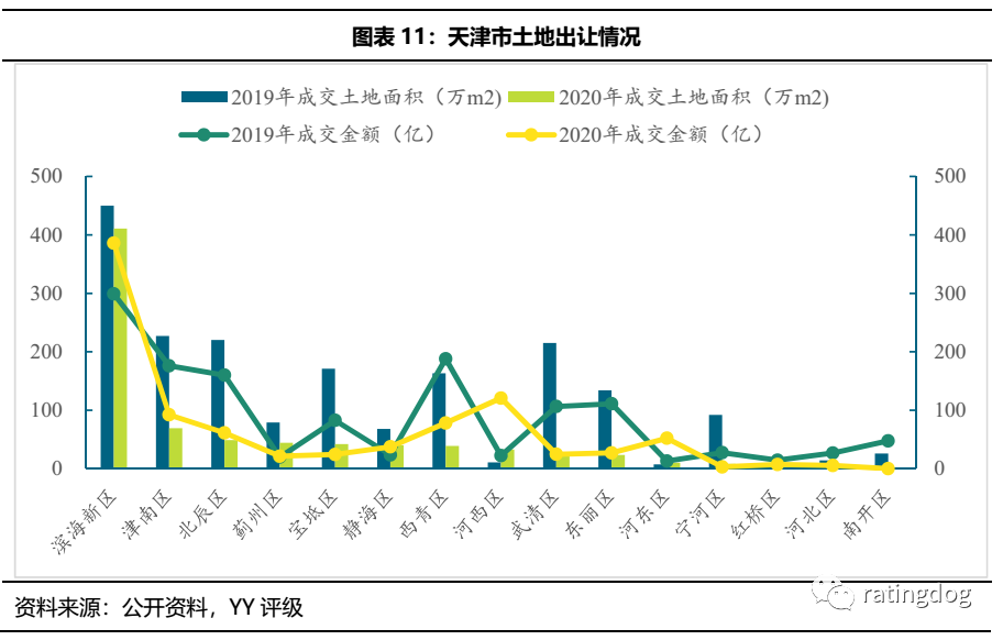 從土地出讓情況來看,2020年相較于2019年,土地出讓面積和成交金額均大幅下降,除河西區(qū)土地成交面積較2019年增加以外,其余區(qū)域土地成交面積均下降,濱海新區(qū)土地成交面積小幅下滑,但成交金額增加。