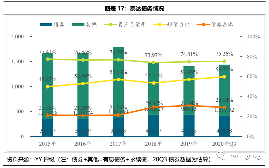 從債務(wù)來看,泰達(dá)控股負(fù)債率長期處于高位,有息債務(wù)規(guī)模龐大,品種上以銀行借款和債券為主,債券規(guī)模變動(dòng)不大;債務(wù)期限結(jié)構(gòu)短期化,短債占比過半,整體債務(wù)壓力很大。截至20年9月末,公司負(fù)債率75.26%,債券融資約400億元,短債占比近60%,短期滾續(xù)壓力很大。