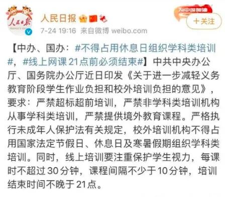 今年7月,中央辦公廳、國(guó)務(wù)院辦公廳印發(fā)了《關(guān)于進(jìn)一步減輕義務(wù)教育階段學(xué)生作業(yè)負(fù)擔(dān)和校外培訓(xùn)負(fù)擔(dān)的意見(jiàn)》的通知,對(duì)教培機(jī)構(gòu)的上課時(shí)間、內(nèi)容,做出了極為嚴(yán)格的限制。