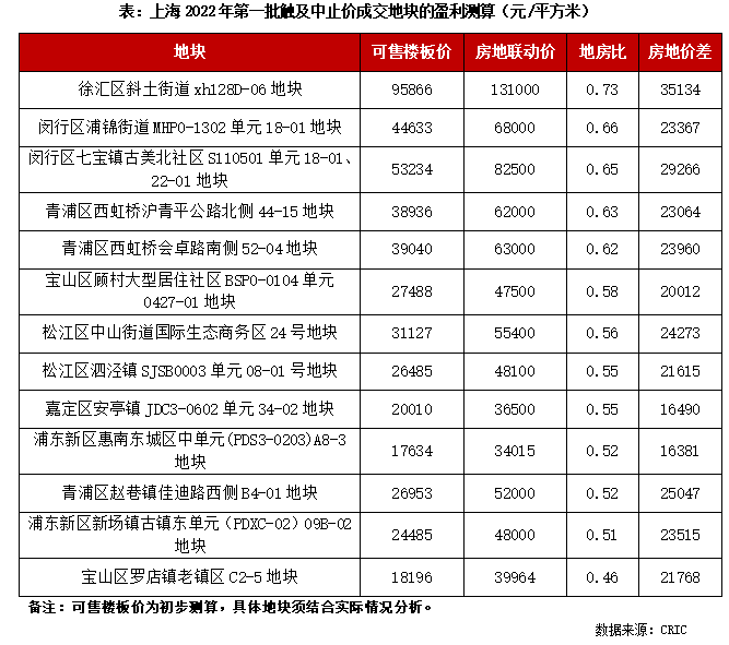 以觸及中止價格的13幅地塊來看。13幅地的平均地房比達0.58,略高于36宗地的平均地房比,但平均房地價差也2.3萬元/平方米以上,盈利空間仍然充裕。以此次成交樓板價最高的徐匯區(qū)斜土街道xh128D-06地塊來看,雖然剔除配套公建后該宗地可售地價超過9.5萬元/平方米,但其所在的徐匯濱江片區(qū)是上海房價的天花板,商品住宅限價達13.1萬元/平方米,因此項目的房價地價差高達3.5萬元/平方米以上,項目仍留有一定的盈利空間。