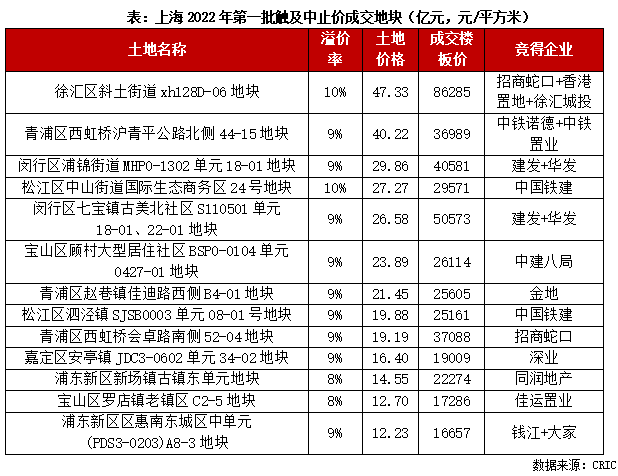 1)觸及中止價成交地塊:共有13宗,主要集中在近郊熱點成交板塊,如閔行古美、浦江、松江新城、青浦趙巷、西虹橋等板塊。這些板塊配套較為成熟,購房客戶認可度較高,板塊內項目去化表現比較佳,如青浦趙巷板塊內項目在上海今年一批次新房開盤去化率接近100%,房企拿地風險相對較小,土地市場競拍熱度相對較高。此外,中心城區(qū)也有1幅地觸及中止價成交,該地塊為徐匯區(qū)斜土路街道地塊,由招商蛇口、香港置地、徐匯城投聯(lián)合體以47.33億元的總價斬獲,溢價10%。