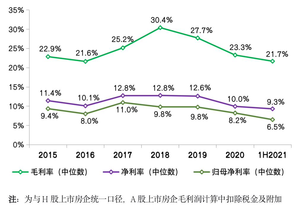 CRIC數據顯示,今年上半年80家典型上市房企毛利率中位數僅為21.7%,同比降低1.6個百分點。凈利率和歸母凈利率中位數分別降低0.6和1.7個百分點至9.3%和6.5%。三大核心指標均呈現下行趨勢,上半年降幅較2020年進一步擴大。