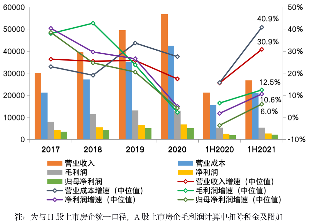 2021年上半年,CRIC監測的80家典型上市房企整體實現營收收入26839億元、營業成本21039億元,營收和營業成本的增速中位值分別為30.9%和40.9%。