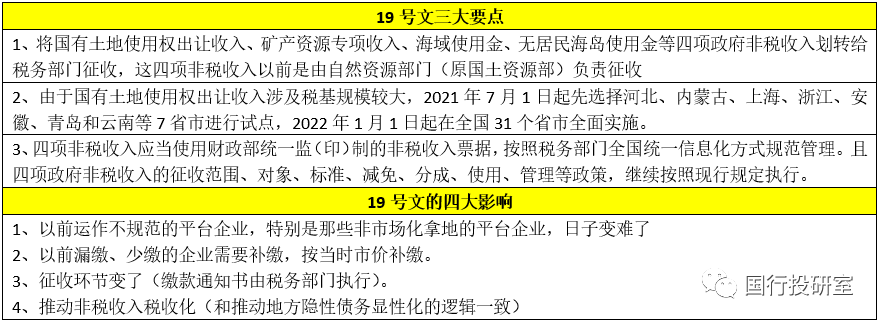 3、2018年2月28日和2018年7月20日分別發布的《關于深化黨和國家機構改革的決定》和《國稅地稅征管體制改革方案》明確“將省級和省級以下國稅地稅機構合并,并要求合理確定非稅收入征管職責劃轉至稅務部門的范圍,對依法保留、適宜劃轉的非稅收入項目成熟一批劃轉一批”。而與之相對應,2021年6月4日四部門聯合發布的19號文(參見土地出讓收入劃轉稅務部門征收,如何正確理解?)便是具體實踐。