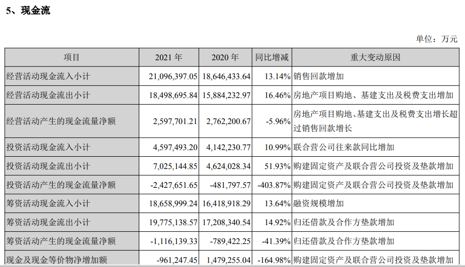 不過有趣的是,杠桿地產看到,招商蛇口經營活動產生的現金流量凈額2021年為259.77億元,2020年為276.22億元,下滑5.96%。