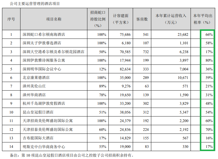 同樣,通過年報,杠桿地產看到,招商蛇口旗下的酒店營收和年均出租率就更差。