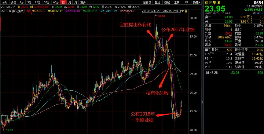 裕元集團在寶勝提出私有化要約第二日股價創下歷史高點38.4港元,但是隨著2017年利潤下滑公告披露和寶勝私有化宣告失敗,裕元集團的股價不斷下跌,目前股價約為24港元,較最高點下跌了37.63%,一舉回到一年前的股價水平。