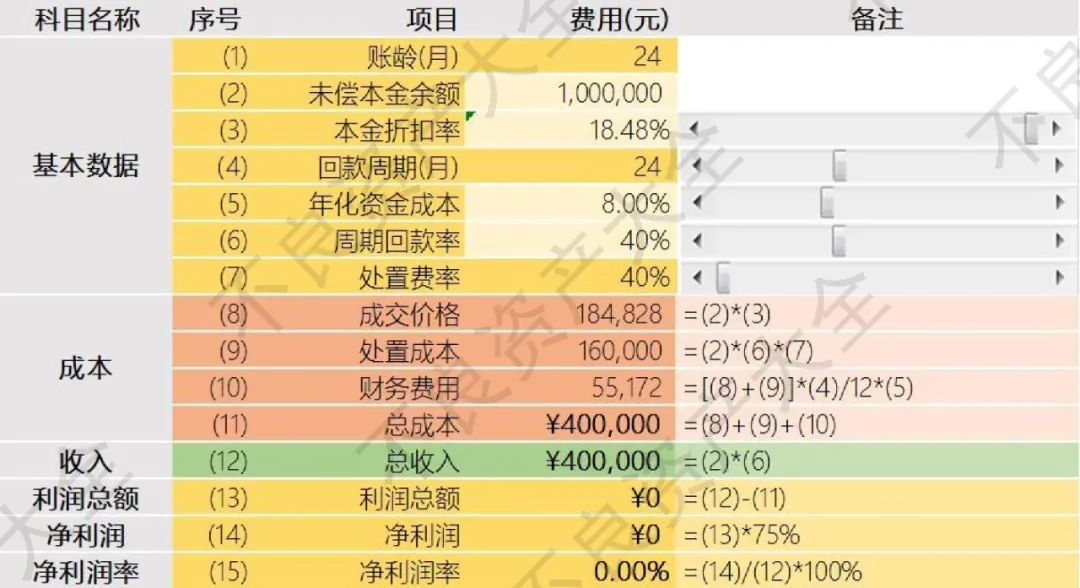 賬齡在24個月以上的銀行個貸不良,目前市場上平均全周期回款率要低于40%,此處按照2年回款率40%計算。