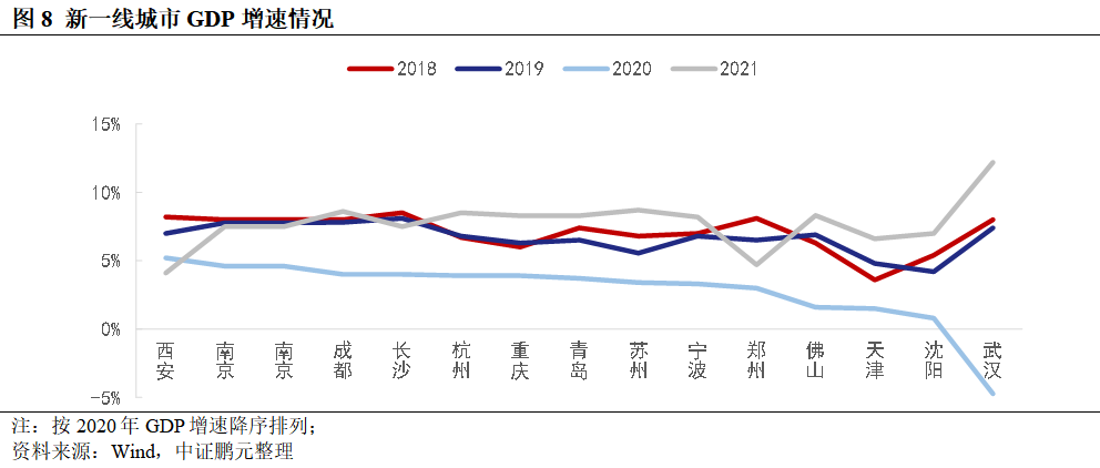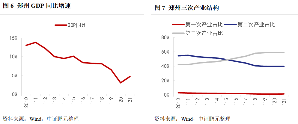 鄭州的GDP增速2010年后呈現明顯下行,尤其是2018年后。與新一線其他城市相比,2018-2020年鄭州GDP增速分別位列第2、第10、第11。由于疫情和洪水影響,2021年鄭州GDP增速有所恢復,仍低于2018和2019年,位列第第14,與西安情況類似。從產業結構看,鄭州長期以第二產業為主,2015年后第三產業增加值占比上升至50%以上,2018年后相對穩定,與當地房地產發展進程和推進產業轉型相關。