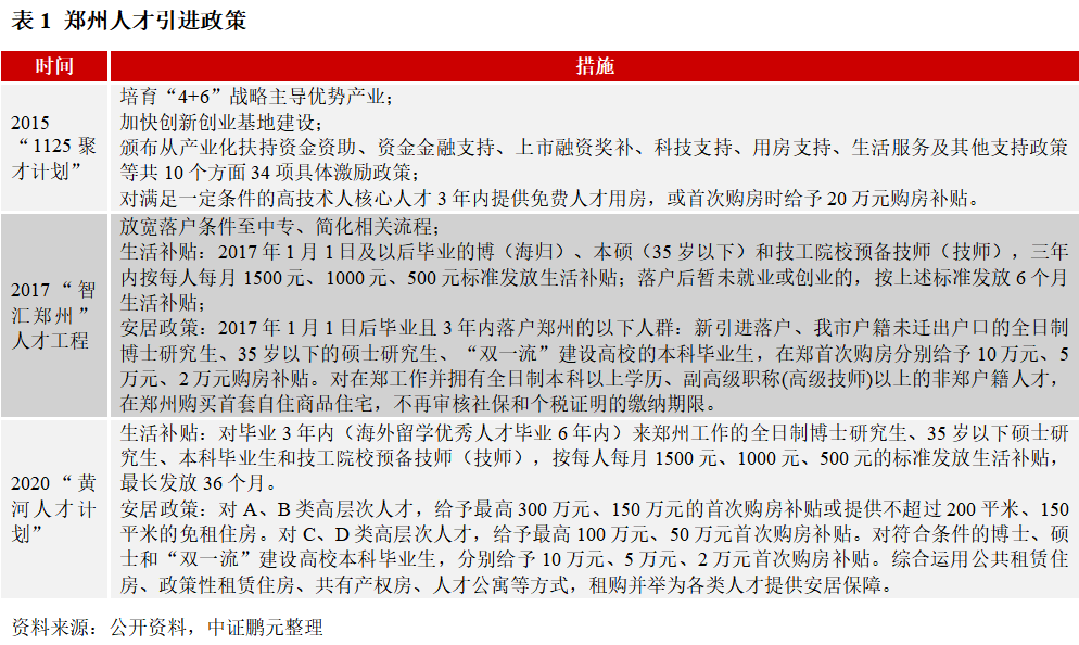 政策有效性:第一,地產只是當下病癥的切入點。從《通知》看出,政策在“人-金融-地產”三個方面發力,致力于平衡短期地產風險和長期發展。但同時也存在著幾個難題:第一,“限房價,竟地價”、預售制度和“兩集中”政策,對房企后續發展提出更高的要求,對于當前鄭州內眾多困難房企來說,化解“爛尾項目”是當前主要的目標。第二,居民收入難以帶動購房消費。第三,當地銀行的支持能力或相對有限。第四,地方政府財力不足。第五,此次“貨幣化安置”,與前兩輪存在差異。第二,留住人,是最終的政策方向。在土地財政的怪圈里,“土地-房地產-金融 -城鎮化”短期內可以快速提高經濟總量,但長期并不支持高房價下的高增長。一個城市的發展,最終需要依靠產業自身。留住人才的關鍵需要兩方面因素,一是產業發展,二是公共服務完善。對于鄭州,當前尤其要提高教育、創業就業方面的支持力度。