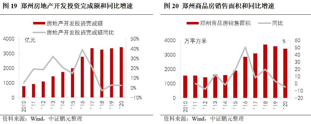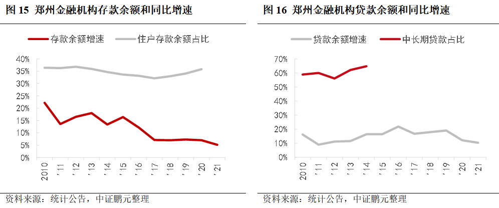 金融機構存款余額增速2013年后波動下降,貸款增速呈現先升后降,其中2013年和2014年中長期貸款占比明顯提升,與當時購房潮相關。2017年后存貸款余額增速相對穩定,2020年來增速再次明顯下降。不良貸款率方面,本地銀行中鄭州銀行和中原銀行2018年來不良率高于2%。其中,截至2020年末,鄭州銀行房地產相關貸款合計占比34.21%,不良貸款占比18.15%;中原銀行房地產相關貸款占比32.63%,其中個人住房按揭貸款占比 23.92%,超過監管限額要求。