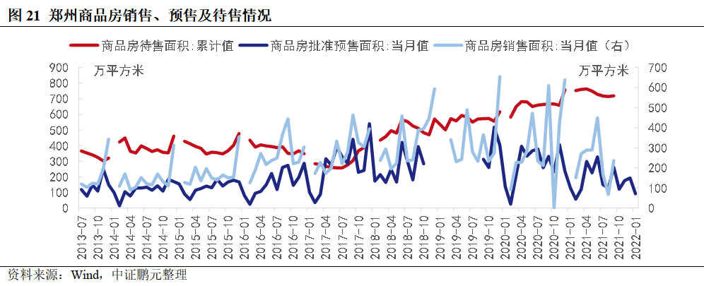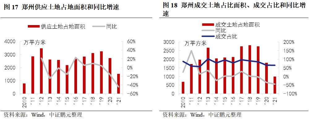 2020年新冠疫情又帶來新的沖擊下,鄭州土地成交面積增速降至約-50%,房地產開發投資完成額和銷售面積增速降至0%附近,房價大幅下跌。2021年鄭州相繼遭遇水災、疫情影響,房地產企業受到重創,銷售額繼續下降,現金流壓力大幅攀升,在建項目工程進度放緩甚至停工,新增預售面積明顯下降,待售面積持續增長,去化周期攀升,地區分化明顯。截至2021年9月,待售商品房面積719.14萬平方米。拿地方面,三次集中供地89宗,成交74宗,平均溢價率分別為10.8%、2.5%和0.6%,受競拍規則趨嚴影響,2021年拿地呈現出“國進民退”。
