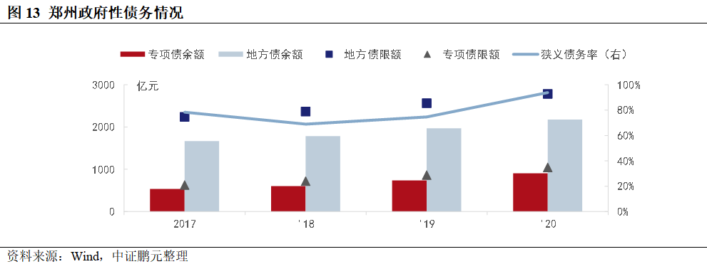 與其他14個新一線城市相比,鄭州的狹義債務率位于第八位,從債務結構看,鄭州專項債余額占比較低,2020年為42%,武漢、成都和西安均在65%以上。