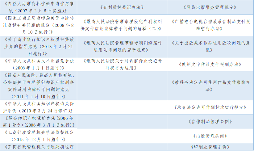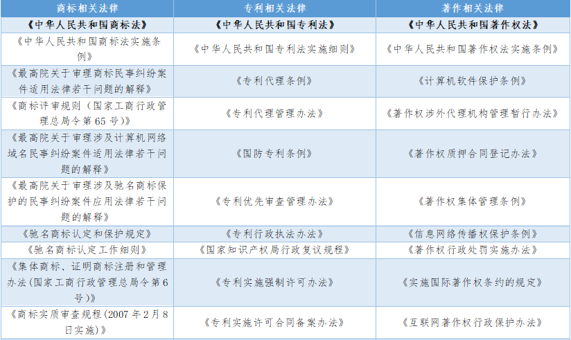 “知識產權”一詞在我國作為法律用語,被正式確認是在1986年的《民法通則》中。現行法律中,《商標法》、《著作法》、《專利法》是知識產權的三大法律支柱。