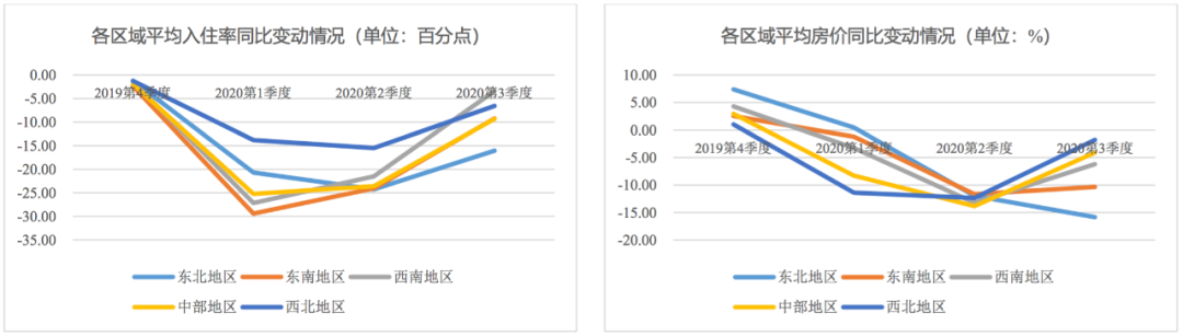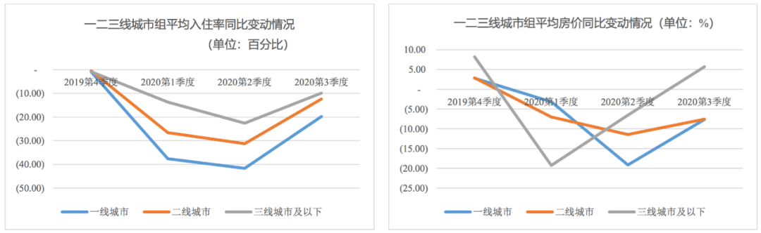 從不同等級(jí)城市組看,一二三線城市組酒店業(yè)在上半年均受疫情影響嚴(yán)重,三季度均有所好轉(zhuǎn),但不同等級(jí)城市組恢復(fù)情況有所不同。其中,一二季度房?jī)r(jià)和入住率下跌幅度從小到大為三線城市組、二線城市組和一線城市組,三線城市組酒店業(yè)受損相對(duì)較小;而三季度酒店業(yè)恢復(fù)程度由好到弱同為三線城市組、二線城市組和一線城市組。整體看,三線城市酒店業(yè)受疫情影響相對(duì)較小、恢復(fù)較快;而一二線城市酒店客源因全球疫情影響海外客源大幅減少并尚未完全恢復(fù),且一二線城市管控更嚴(yán),酒店業(yè)恢復(fù)程度較慢。