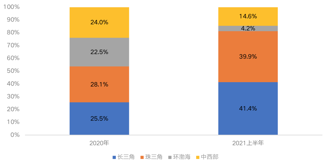 圖:萬科2020年及2021年上半年各區投資占比情況(剔除22城)