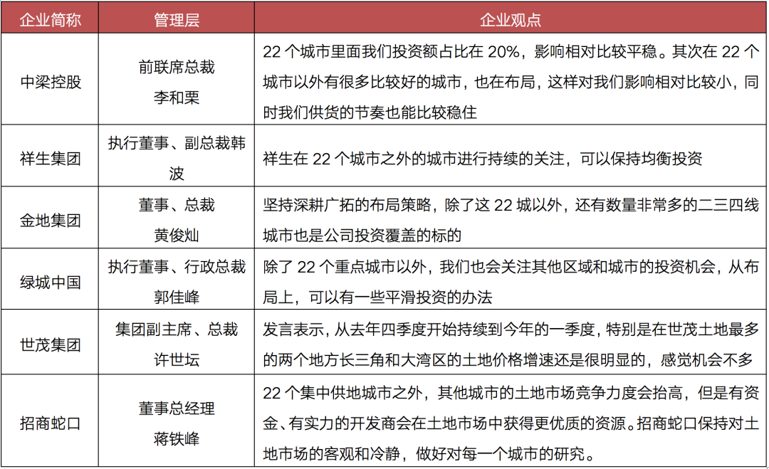 在人們紛紛把目光放在集中供地的22城之時,我們發現,除了這22城之外,房企的投資也出現了一定的變化,如中梁、祥生、金地、綠城表示要尋求22城之外投資機會,招商蛇口、世茂直言部分熱點區域土地價格被抬高。