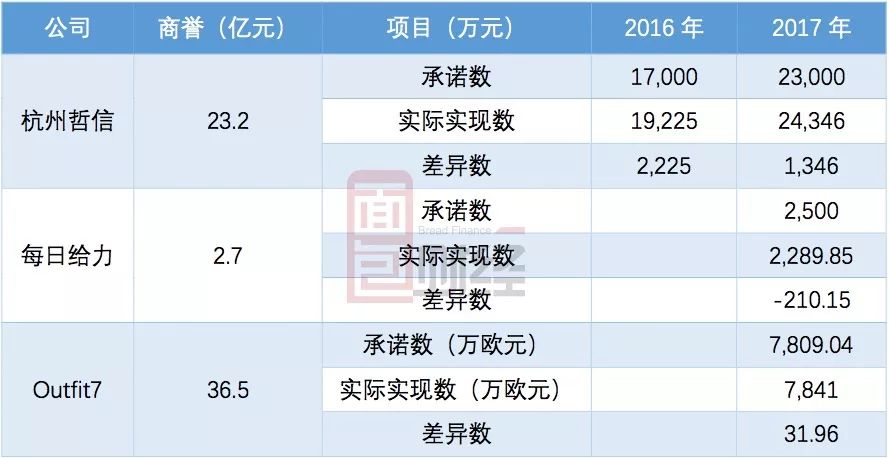 此外,形成商譽最大的Outfit7,2017年業(yè)績也是壓線完成。Outfit7公司2017年度實現(xiàn)扣非后歸母凈利潤7841萬歐元,僅超過承諾數(shù)31.96萬歐元。以下為根據(jù)公開數(shù)據(jù)統(tǒng)計的主要幾家子公司業(yè)績完成情況: