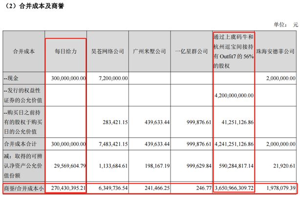 其中,通過上虞碼牛和杭州逗寶間接持有Outfit7的56%的股權(quán)收購價高達42.41億元,合并形成商譽約36.5億。