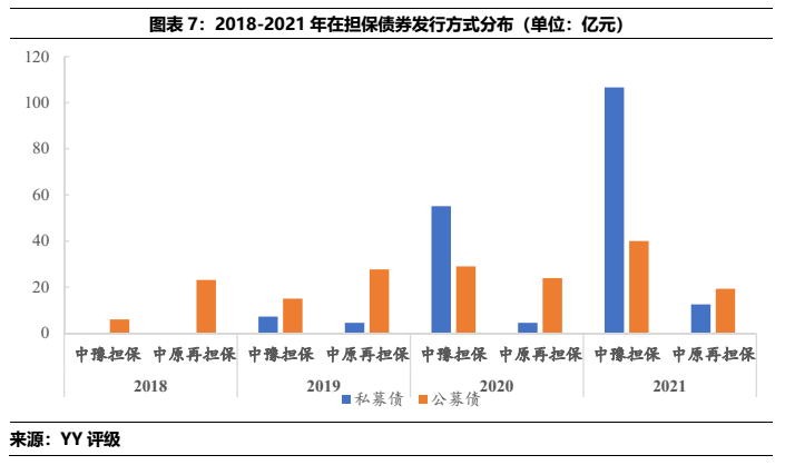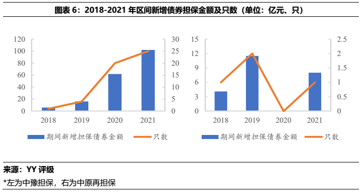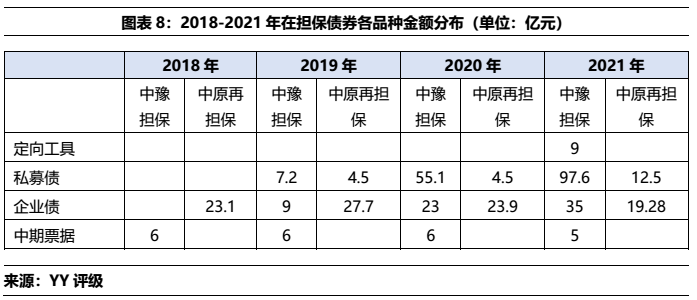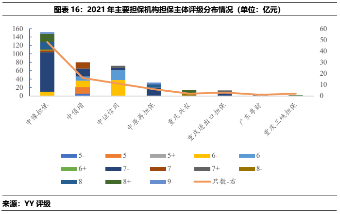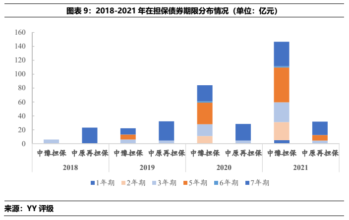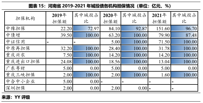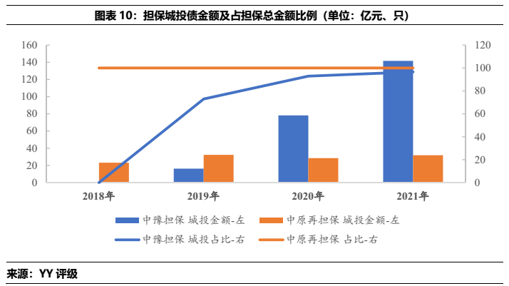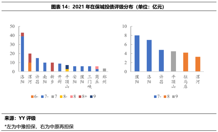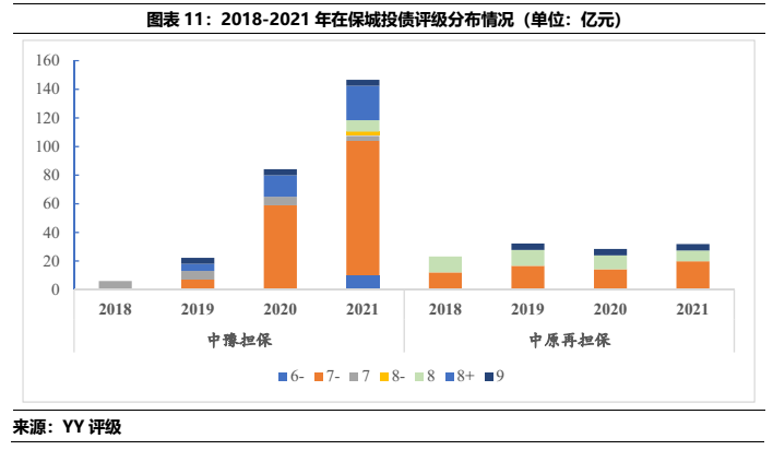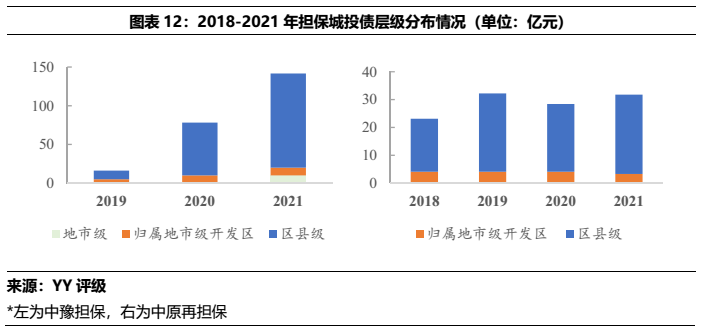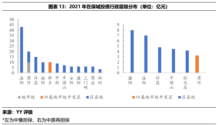 從中豫擔(dān)保和中原再擔(dān)保的展業(yè)情況看,二者僅在省內(nèi)展業(yè),中豫擔(dān)保在主要的直保業(yè)務(wù)上規(guī)模遠(yuǎn)大于中原再擔(dān)保,同時(shí)二者債券擔(dān)保中城投占比很高,2021年的在保城投債分別占總擔(dān)保債券的97%(中豫增)和100%(中原再擔(dān)保)。所擔(dān)保城投債YY評(píng)級(jí)集中在7檔和8檔,所處行政區(qū)域中以區(qū)縣級(jí)為主,各城市中洛陽(yáng)市的擔(dān)保體量較為突出,其次是許昌、漯河和新鄉(xiāng)。