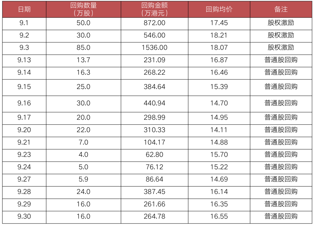 尤其是新城悅服務(wù),自7月6日開(kāi)始,新城悅服務(wù)持續(xù)用“股份激勵(lì)計(jì)劃的受托人買入”和“公司回購(gòu)”兩種方式從二級(jí)市場(chǎng)買入公司股份。其中,9月份回購(gòu)次數(shù)16次,涉及金額6131.83萬(wàn)港元。