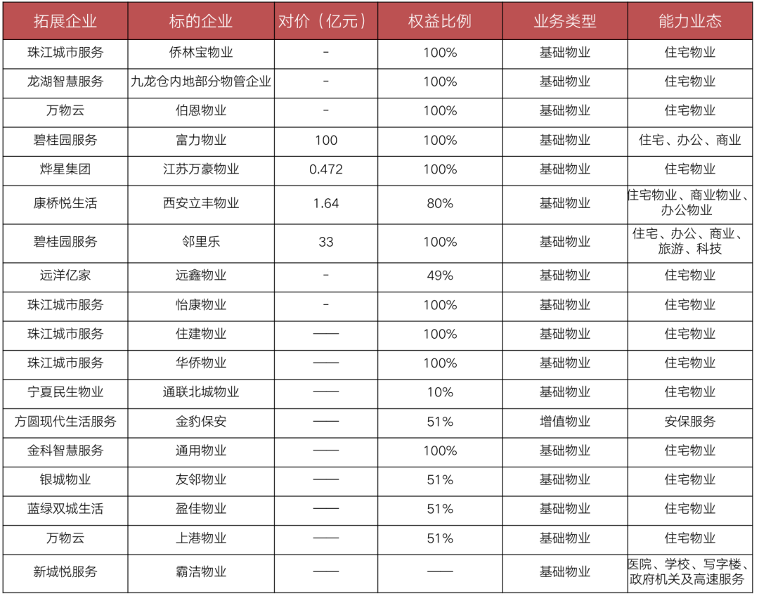 提及收并購(gòu),今年首當(dāng)其沖的便是碧桂園服務(wù):2月25日,以48.47億元收購(gòu)藍(lán)光嘉寶服務(wù)64.62%股權(quán),開(kāi)創(chuàng)首例上市物企間的并購(gòu),48.47億元的價(jià)格也創(chuàng)下了彼時(shí)業(yè)內(nèi)的收購(gòu)記錄。9月20日,碧桂園服務(wù)發(fā)布公告稱以不超過(guò)100億元收購(gòu)富力物業(yè),9月28日,發(fā)布公告稱以不超過(guò)33億元收購(gòu)彩生活服務(wù)核心資產(chǎn)鄰里樂(lè)控股。