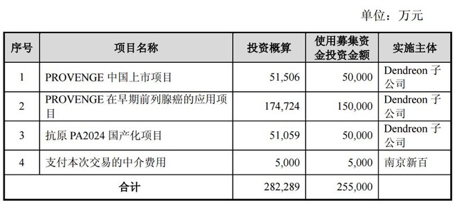 根據(jù)南京新百的收購方案,公司擬配套募資25.5億元用于Provenge在中國上市項目、Provenge在早期前列腺癌的應(yīng)用項目、抗原PA2024國產(chǎn)化項目的建設(shè)運營等。