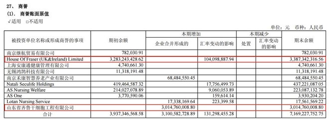 一個是2014年收購英國百貨公司HOF產(chǎn)生的商譽,加上后來匯率波動的影響截止2017年底,這部分的商譽余額是33.87億元。一個是2017年并表齊魯干細胞新增商譽約30.15億元。以下為公司2017年年報中披露的商譽明細情況: