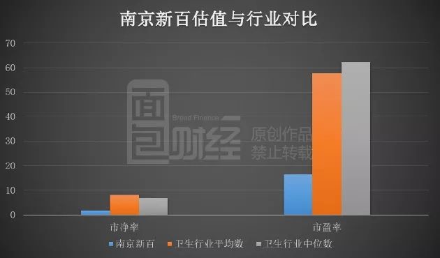 截止2018年7月4日收盤,南京新百總市值146億,市凈率1.8倍,市盈率16.4倍。而統(tǒng)計數(shù)據(jù)顯示,當(dāng)前A股醫(yī)療衛(wèi)生行業(yè)公司,市凈率中位數(shù)為6.96倍,平均數(shù)為8.1倍;市盈率中位數(shù)為62.4倍,平均數(shù)為57.8倍。