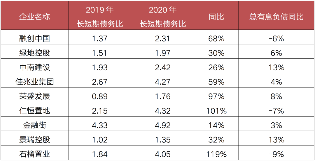 從具體房企來看,2020年在99家重點房企中,有52家房企的長短期債務比出現不同程度的改善,其中融創、佳兆業、榮盛等房企,不僅控制了總有息負債規模的增長,債務結構也優化顯著。