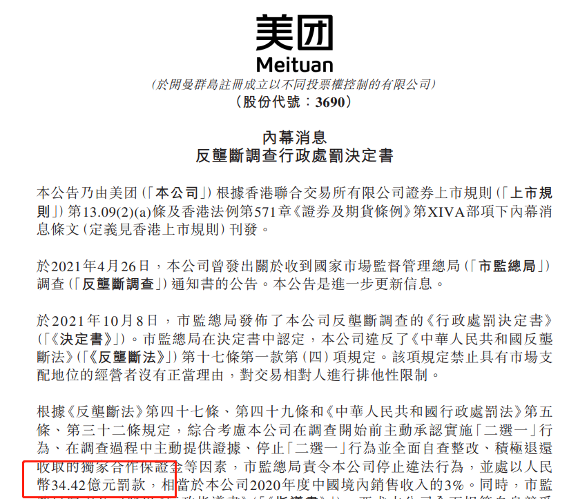 10月8日,國家市場監(jiān)管總局根據(jù)《中華人民共和國反壟斷法》第四十七條、第四十九條規(guī)定,綜合考慮美團違法行為的性質(zhì),依法作出行政處罰決定,責令美團停止違法行為,并處以其2020年中國境內(nèi)銷售額3%的罰款,計34.42億元。