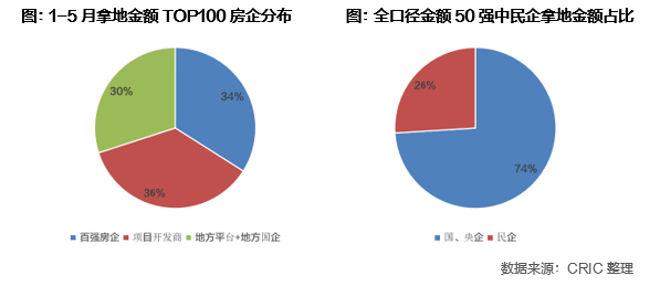 從1-5月拿地金額TOP100房企來看,百強房企拿地數量僅占到34%,幾乎全部集中在銷售TOP50企業之中,如建發、華潤、中海、萬科等1-5月拿地金額超過200億元。此外,項目開發商和地方平臺公司個占到36%和30%。