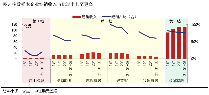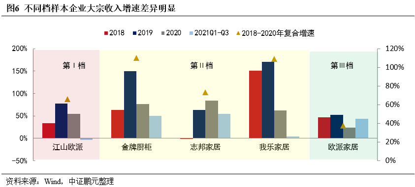 從三年復合增速看,江山歐派以大宗業(yè)務為主業(yè),其增速水平仍然不低,金牌廚柜、志邦家居、我樂家居均保持了70%以上的增速,歐派家居增速最低。從2021年前三季度大宗業(yè)務增速來看,三檔企業(yè)分化更加明顯。歐派家居仍保持增長,江山歐派已出現(xiàn)負增長,第II檔的我樂家居增速也受到重創(chuàng)。金牌廚柜和志邦家居增速受影響較小,主要是金牌廚柜的代理模式占比高,志邦家居調整客戶結構后恒大等高負債客戶合作量大幅下降所致。