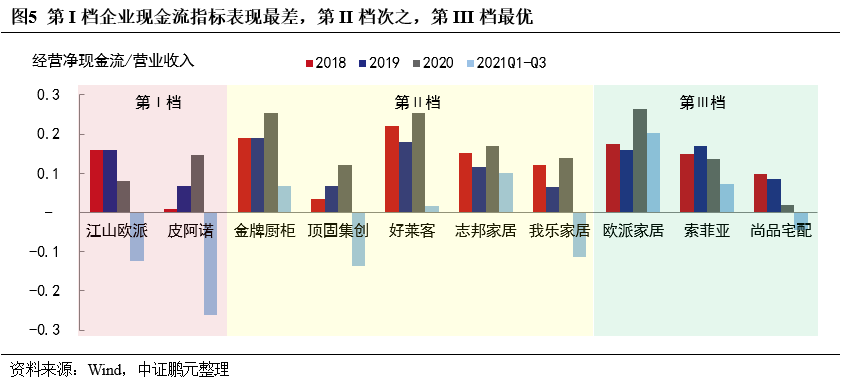 大宗業(yè)務占比高或大宗客戶風險大的樣本企業(yè)經營現(xiàn)金流弱化。2021年下半年以來房企流動性緊張,直接影響定制家居企業(yè)回款。江山歐派和皮阿諾經營現(xiàn)金流指標在2021年1-9月出現(xiàn)明顯的下滑,頂固集創(chuàng)由于積極推進大宗業(yè)務,業(yè)務合作保證金支出較大拖累經營現(xiàn)金流,我樂家居2021年半年報顯示其應收賬款前五大均為恒大地產、華夏幸福及金科地產的關聯(lián)企業(yè)。尚品宅配不涉及大宗業(yè)務,其經營現(xiàn)金流指標弱化則是由于戰(zhàn)略調整,全面轉型整裝業(yè)務所致。