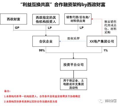西政作為GP與總包商/材料供應(yīng)商/房產(chǎn)銷售代理商以及其他機(jī)構(gòu)投資人共同成立合伙企業(yè)。
