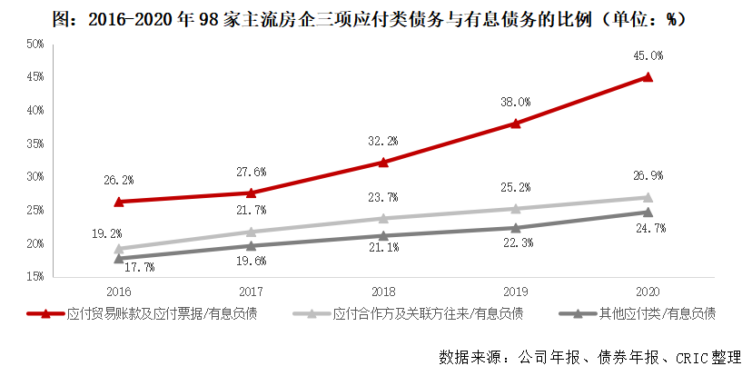 在三項應付類債務中,近年來增速最明顯的則是應付貿易賬款及票據,從2016年的26.2%快速攀升至2020年45%。得益于產業鏈上得天獨厚的話語權優勢,房企無償占用供應鏈資金的現象嚴重,其中八成是無息的應收賬款,帶息的應付票據規模有限,而合作方及關聯方應付類往來款項和其他類應付款項占有息負債25%上下。