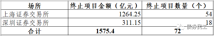 根據上海證券交易所和深圳證券交易所公司債券項目信息平臺的公開信息,2022年2月終止的債券項目(小公募、私募債和ABS)金額合計為1575.40億元,終止項目數量72個。其中上海證券交易所終止金額為1264.25億元,占比為80.25%;深圳證券交易所終止金額為311.15億元,占比為19.75%。