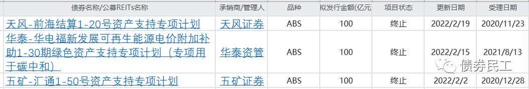 從具體申報產品的規(guī)模來看,單只債券終止金額最大的均是ABS產品,其中有3個ABS產品的金額為100億元,均屬于儲架類ABS產品。2022年以來,儲架類ABS產品終止的情況較多。重慶國際信托股份有限公司和廈門國際信托有限公司作為原始權益人申報的擬發(fā)行金額為400億元的“華融-新遠1-20期資產支持專項計劃”于2022年1月20日終止。債券民工查詢了一下交易所系統信息,僅在2022年1月就有3只總申報規(guī)模超過100億元的ABS產品被終止。而2021年全年被終止的100億元的ABS產品就更多了,僅在上交所終止的產品就有50只。