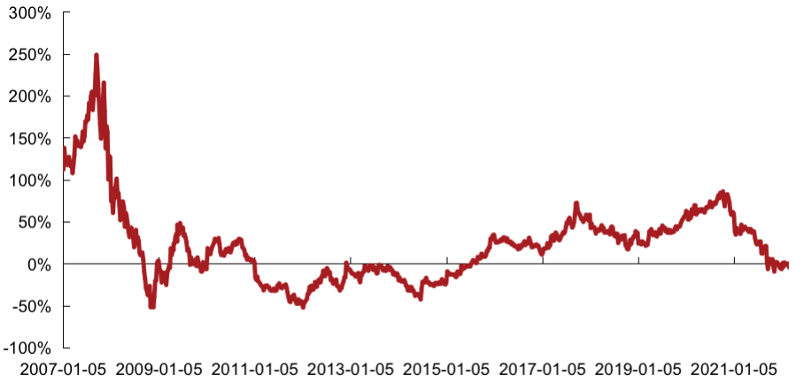 圖:2月克而瑞內房股領先指數成分股相對恒指整體PB小幅上升后繼續回落