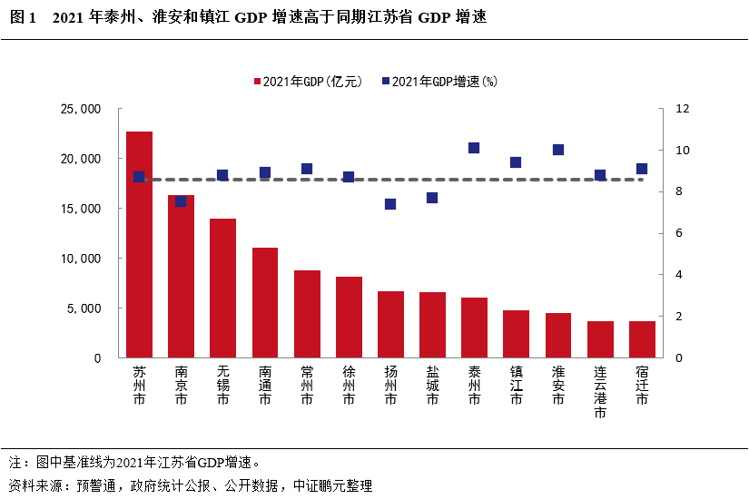 2021年蘇州、南京和無錫GDP規(guī)模繼續(xù)處于領(lǐng)跑地位,但泰州、淮安和鎮(zhèn)江GDP增速高于同期江蘇省GDP增速。2021年江蘇省13個(gè)地級(jí)市GDP規(guī)模均有所提升,但排位順序未發(fā)生變化。從GDP規(guī)模看,2021年GDP規(guī)模突破萬億的地級(jí)市依舊是蘇州、南京、無錫和南通,數(shù)量較2020年無變化。2021年,蘇州、無錫和南京GDP總和占江蘇省GDP的45.61%,較2020年下降0.49個(gè)百分點(diǎn)。蘇北地區(qū)中宿遷、連云港和淮安GDP規(guī)模依舊偏弱,依舊處于省內(nèi)最后三位。從GDP增速來看,2021年由于疫情得到有效控制,各地級(jí)市GDP增速均高于2020年。2021年,南京、揚(yáng)州和鹽城GDP增速低于同期江蘇省GDP增速,泰州、淮安和鎮(zhèn)江雖然廣義債務(wù)負(fù)擔(dān)較重,但2021年GDP增速明顯高于同期江蘇省GDP增速,其余地級(jí)市GDP增速基本和江蘇省GDP增速持平。
