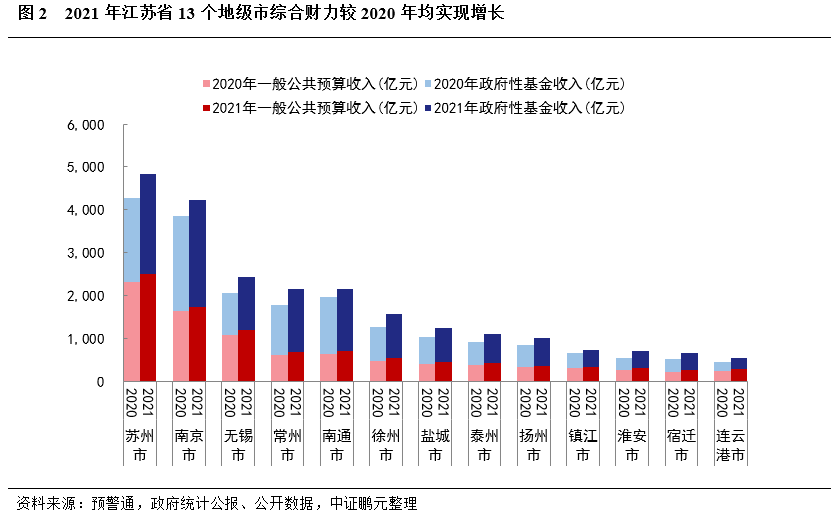 2021年江蘇省13個(gè)地級(jí)市綜合財(cái)力【1】均高于2020年,2021年宿遷財(cái)政自給率水平較2020年大幅提高,鎮(zhèn)江和蘇州財(cái)政自給率則有所下滑。從綜合財(cái)力規(guī)模來看,2021年,除鎮(zhèn)江、淮安、連云港和宿遷綜合財(cái)力在千億規(guī)模以下,其他地級(jí)市綜合財(cái)力均在千億以上,其中泰州市首次突破千億大關(guān)。變動(dòng)趨勢(shì)上,2021年各地級(jí)市一般公共預(yù)算收入和政府性基金收入規(guī)模均高于2020年。從綜合財(cái)力構(gòu)成上看, 2021年江蘇省13個(gè)地級(jí)市里只有蘇州市、南京市和無錫市一般公共預(yù)算收入均在千億以上,分別為2,510億元、1,730億元和1,201億元。2021年,蘇州、南京、無錫、南通、常州和徐州政府性基金收入均在千億元以上,分別為2,316億元、2,493億元、1,226億元、1,442億元、1,468億元和1,035億元。