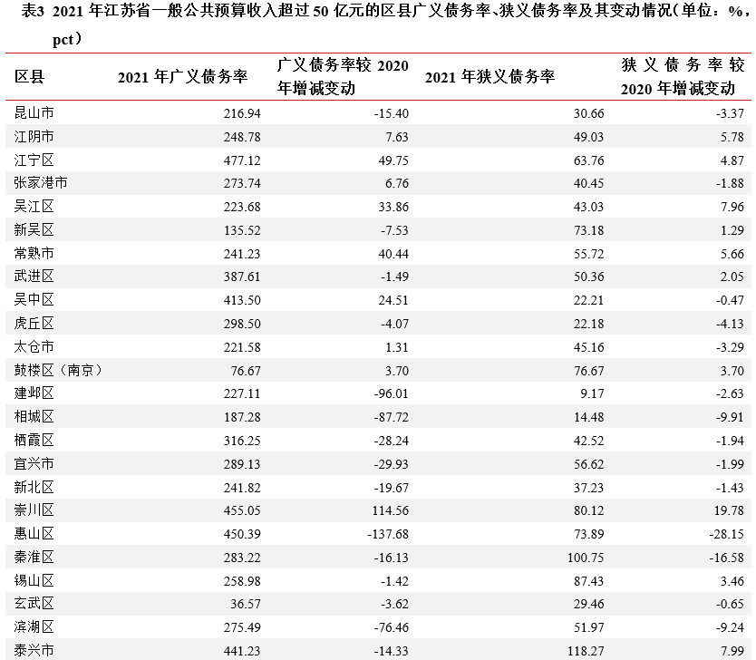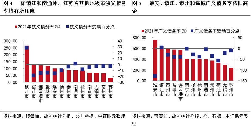 債務(wù)情況:鎮(zhèn)江市化債壓力依舊較大,洪澤區(qū)、高港區(qū)和京口區(qū)狹義債務(wù)率增加明顯,但江蘇省區(qū)縣級(jí)債務(wù)率整體仍有壓降。地級(jí)市層面,2021年除鎮(zhèn)江和南通外,其余地級(jí)市狹義債務(wù)率均有所壓降,2021年鎮(zhèn)江狹義債務(wù)率上升27.91個(gè)百分點(diǎn)至265.59%,淮安、鎮(zhèn)江、泰州和鹽城的廣義債務(wù)率依舊較高。區(qū)縣層面,2021年洪澤區(qū)、高港區(qū)、丹徒區(qū)和泗陽縣狹義債務(wù)率超過200%,債務(wù)負(fù)擔(dān)較重。蘇州市、無錫市和常州市因財(cái)政實(shí)力較強(qiáng),下轄區(qū)縣狹義債務(wù)率整體偏低,2021年江蘇省95個(gè)區(qū)縣中有55個(gè)區(qū)縣狹義債務(wù)率較2020年有所壓縮,其中淮安區(qū)狹義債務(wù)壓縮最明顯(下降81個(gè)百分點(diǎn)),2021年新沂市和洪澤區(qū)廣義債務(wù)率分別超過900%和700%,大豐區(qū)、連云區(qū)、高淳區(qū)、海州區(qū)、浦口區(qū)和溧水區(qū)廣義債務(wù)率亦高于600%,但95個(gè)區(qū)縣中有61個(gè)區(qū)縣廣義債務(wù)率較2020年有所壓降。